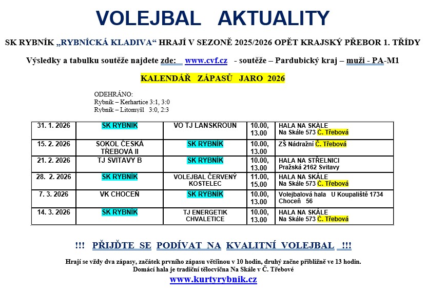 Volejbalisté Rybníka vyhráli suverénně krajskou soutěž KP1 skupinu PA-M1 s náskokem 10-ti bodů Mistrovství ČR veteránů, kde Rybník postoupil do finálové části - hraje se v květnu ( Rybník obhajuje titul Mistr ČR)